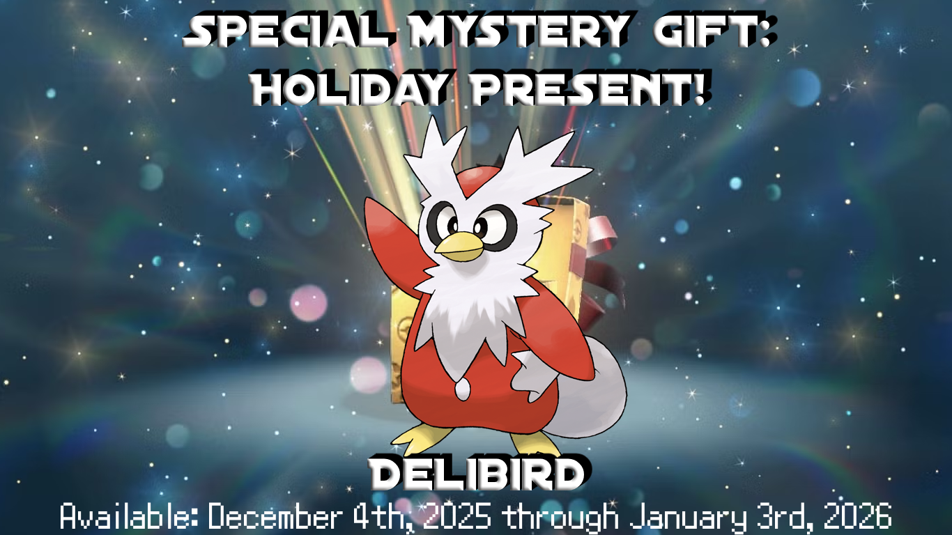 Sol Version has a rotation of Mystery Gift distributions. To learn how to unlock the Mystery Gift feature in Sol Version, see here. The currently running Mystery Gift is a special holiday celebration with Delibird. Only available until January 3rd, 2026!